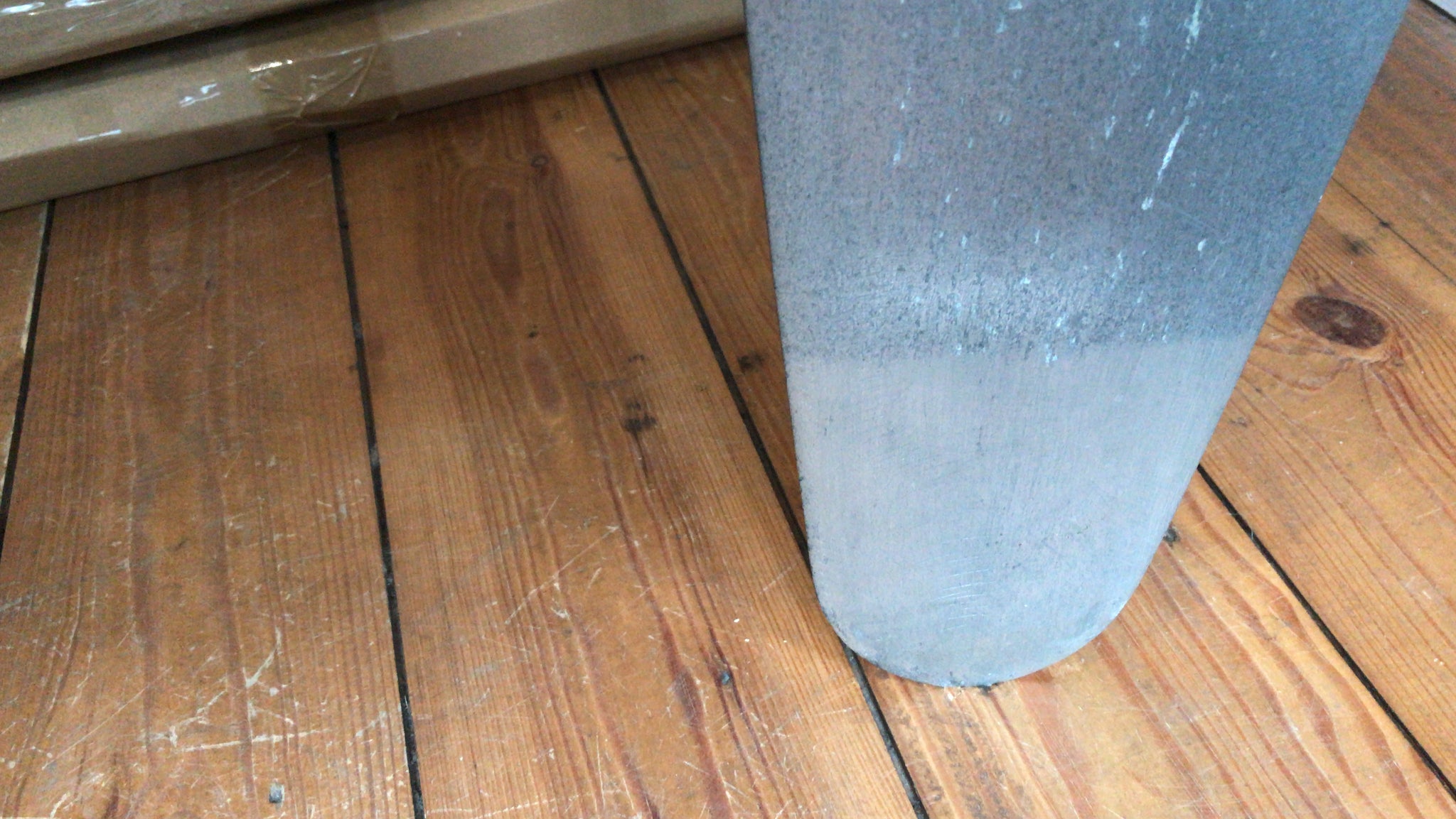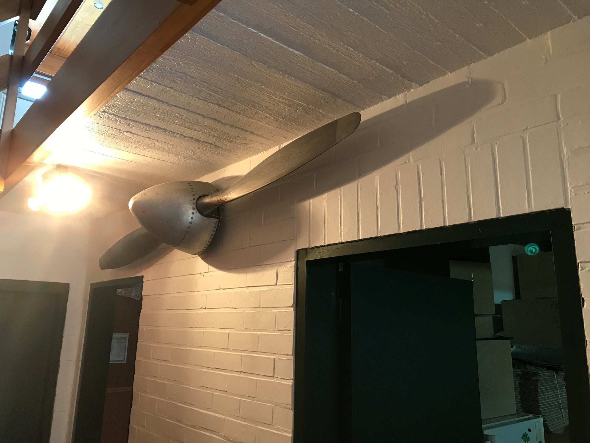Aucun marquage lisible n’est visible sur les emplantures des pales ni sur le moyeu. Une zone plus claire au bout de chaque pale indique la présence passée d’autocollants ou de bandes de protection anti-érosion, comme on en trouvait sur les hélices de fabricants européens ou britanniques (de Havilland, Ratier, Hamilton, etc.). Cette trace ancienne confirme l’origine aéronautique et l’authenticité de la pièce.