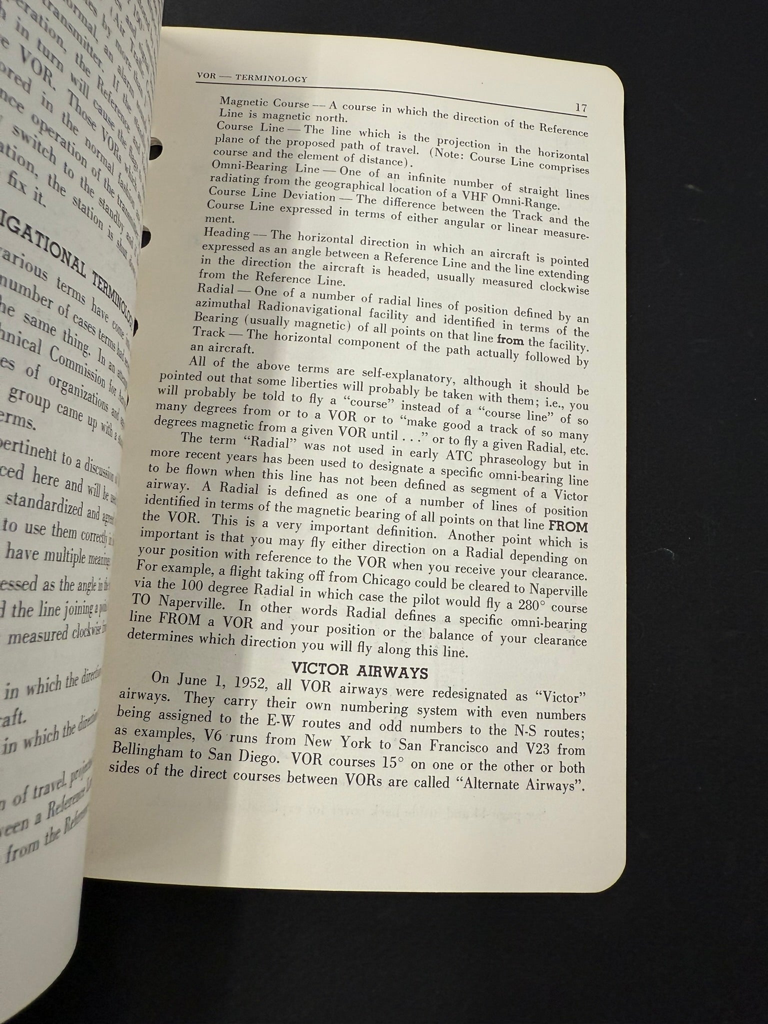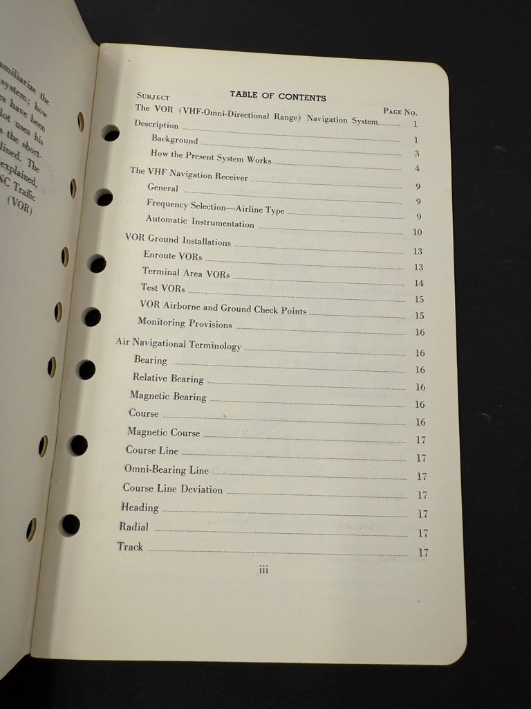 The purpose of this material is to familiarize the airline and executive pilot with the VOR system; how it works and how it is to be used. Analogies have been developed to explain what happens as a pilot uses his instrumentation and the advantages as well as the shortcomings of the new navigation system are outlined. The use of the various types of instrumentation is explained, and the write up closes with a description of ANC Traffic Control Procedures to be used with Victor (VOR) Airways Operations.